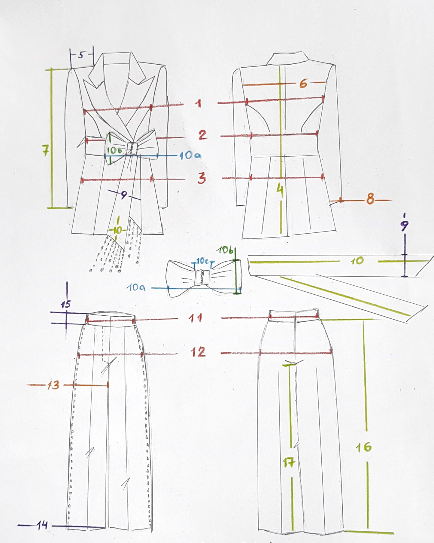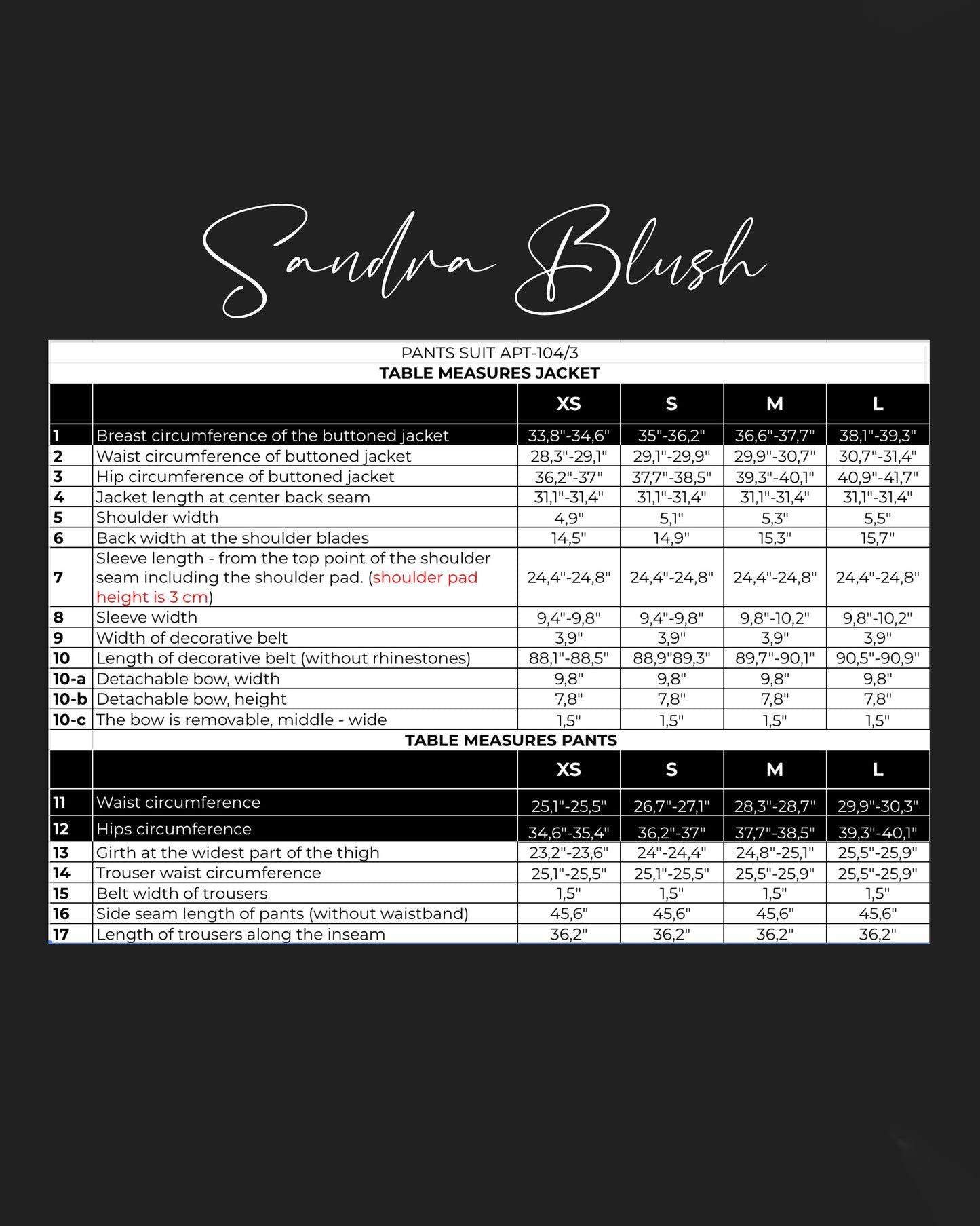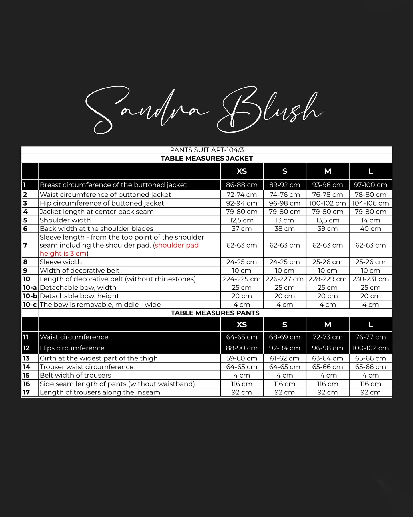 • Additional information: fitted silhouette, long jacket, straight pants. The pants, waistband and bow are decorated with premium rhinestones. The bow on the belt is detachable with a button, and can be used separately as a decoration for your bag. The belt is very long, wrapped around the waist twice. The front has an insert of dense dublerin, which acts as a kind of corset