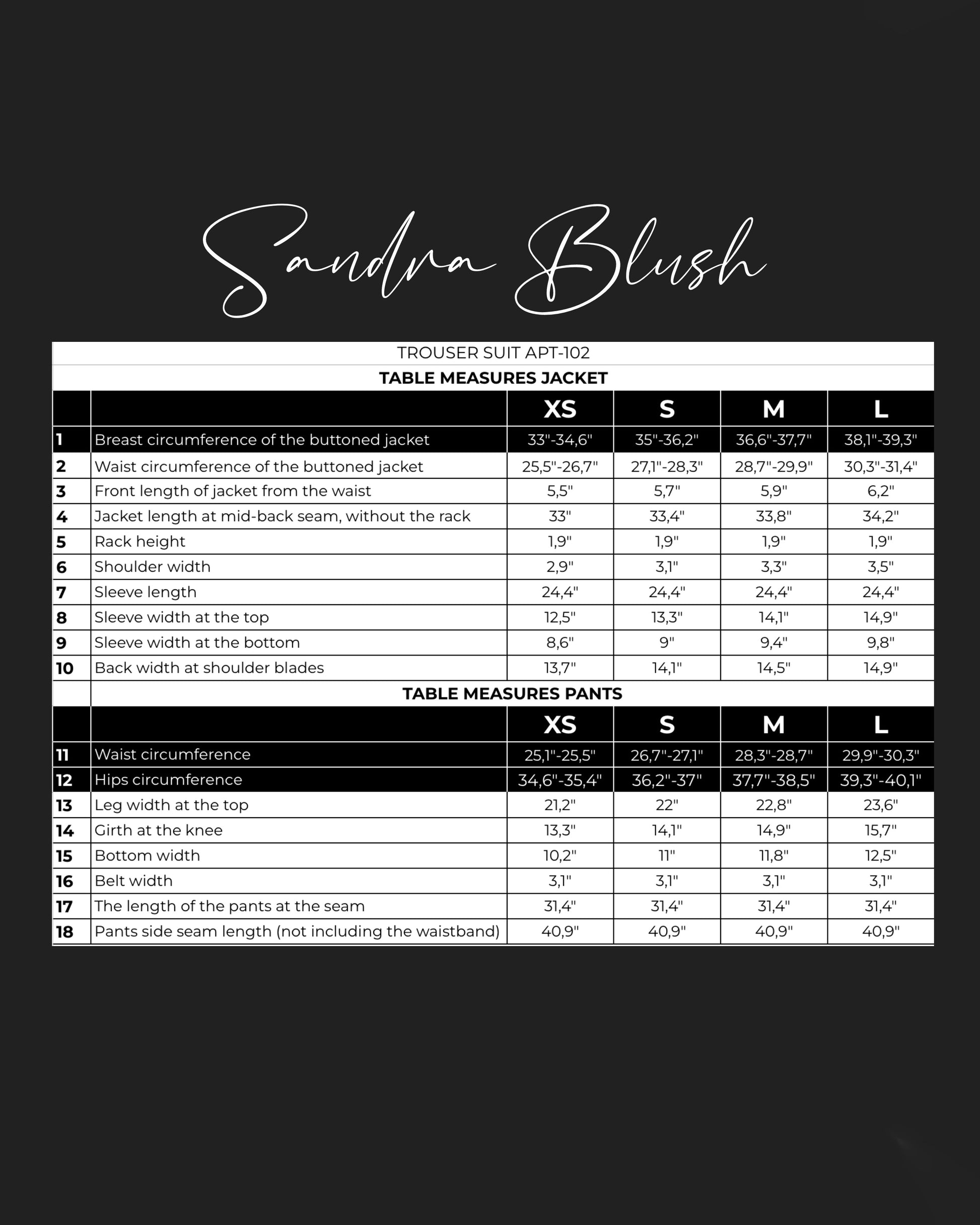 • Adjustment of item: you can change the waist, the width at the hips, the length of the pants, the length of the jacket and the length of the jacket sleeves