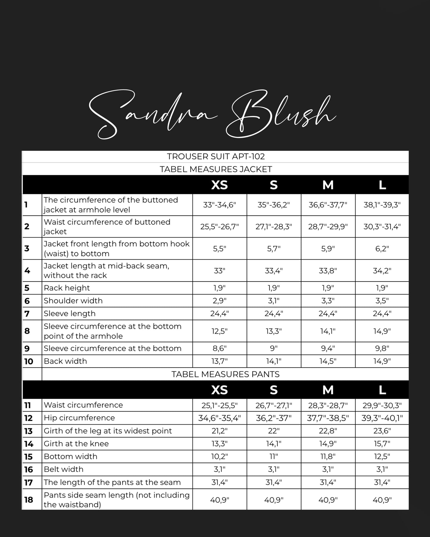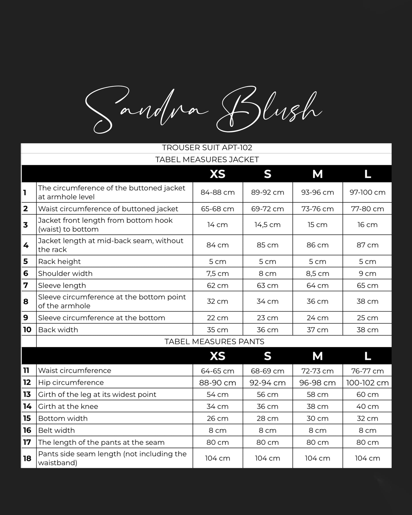 • Adjustment of item: you can change the waist, the width at the hips, the length of the pants, the length of the jacket and the length of the jacket sleeves