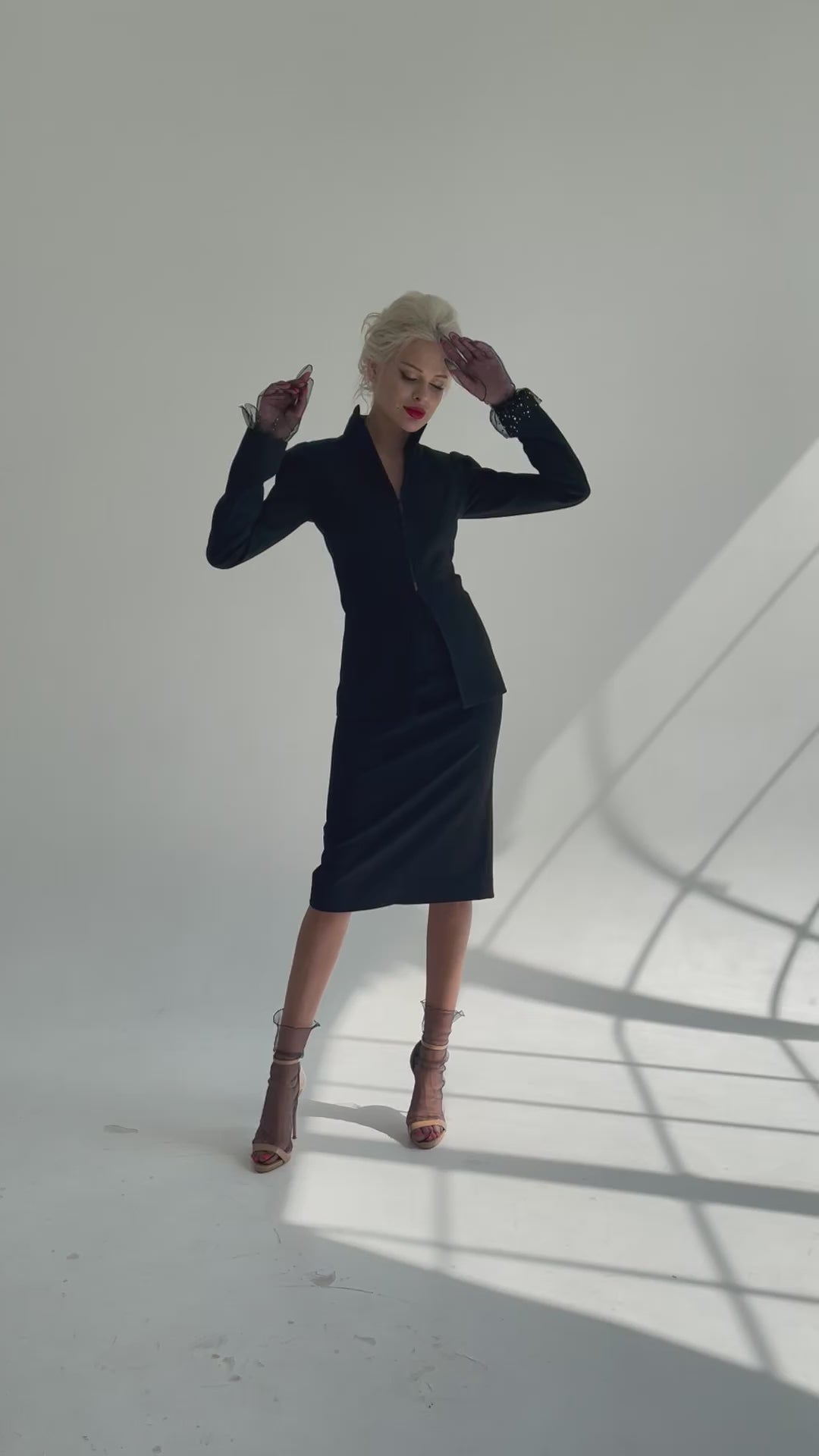 Close-fitting long jacket adds finesse to the figure and accentuates the waist, a midi skirt claims its owner elegantly. The main zest is original fittings. Hand-stitch hooks.