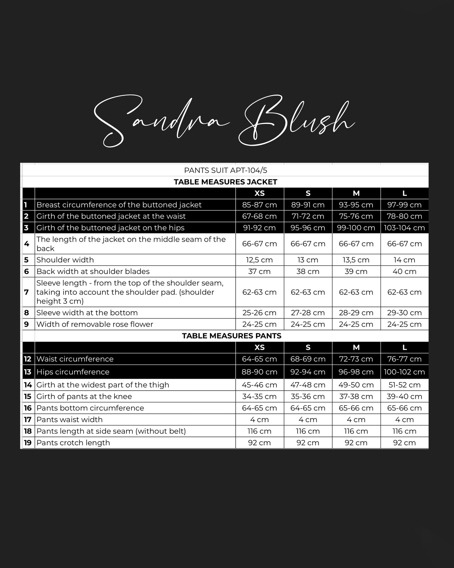 • Additional information: long jacket with wide lapels. It has shoulder pads to give a beautiful shape. The edges of the sleeves are complemented by slits. The flower on the jacket is removable, fixed on a pin. The pockets are decorative. High-fitting clash pants beautifully elongate the silhouette.