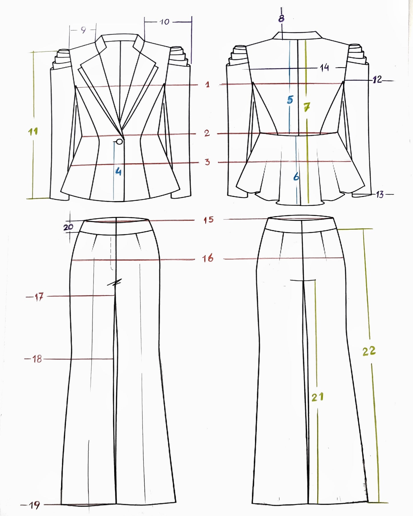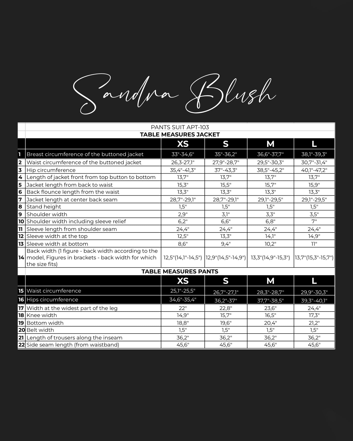 • Additional information: to make the perfect three-dimensional shape of the jacket sleeves, we collect the pleats and fasten them manually. The basque is duplicated on both sides with high-quality dense German sheepskin, so it keeps its shape perfectly. Thanks to a hidden button, the jacket does not open and emphasizes the waist. High rise pants
