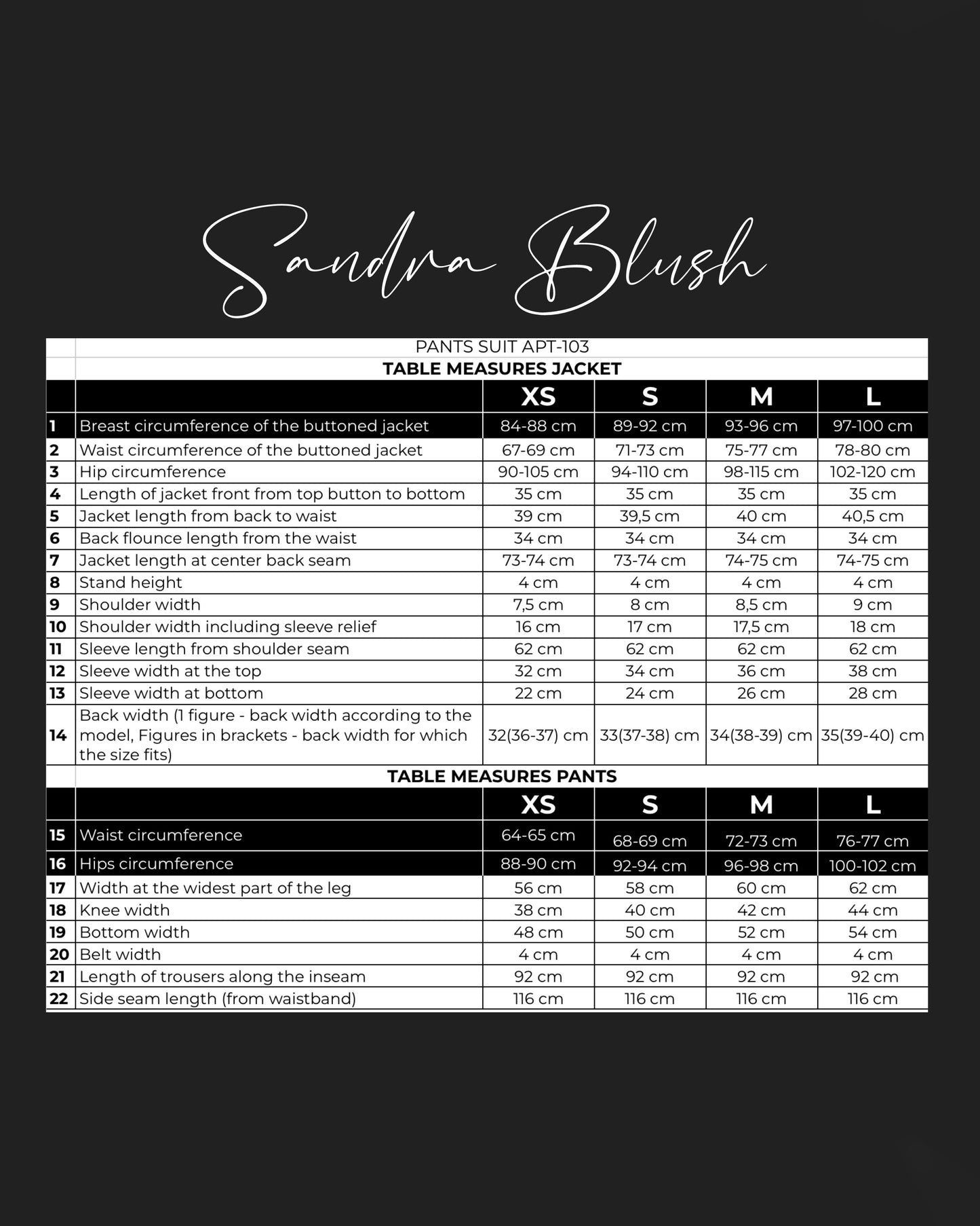 A stylish jacket is the main feature of the suit. Nice voluminous shoulders, elegant basque. Pants with a perfect fit, which visually draws out the silhouette.