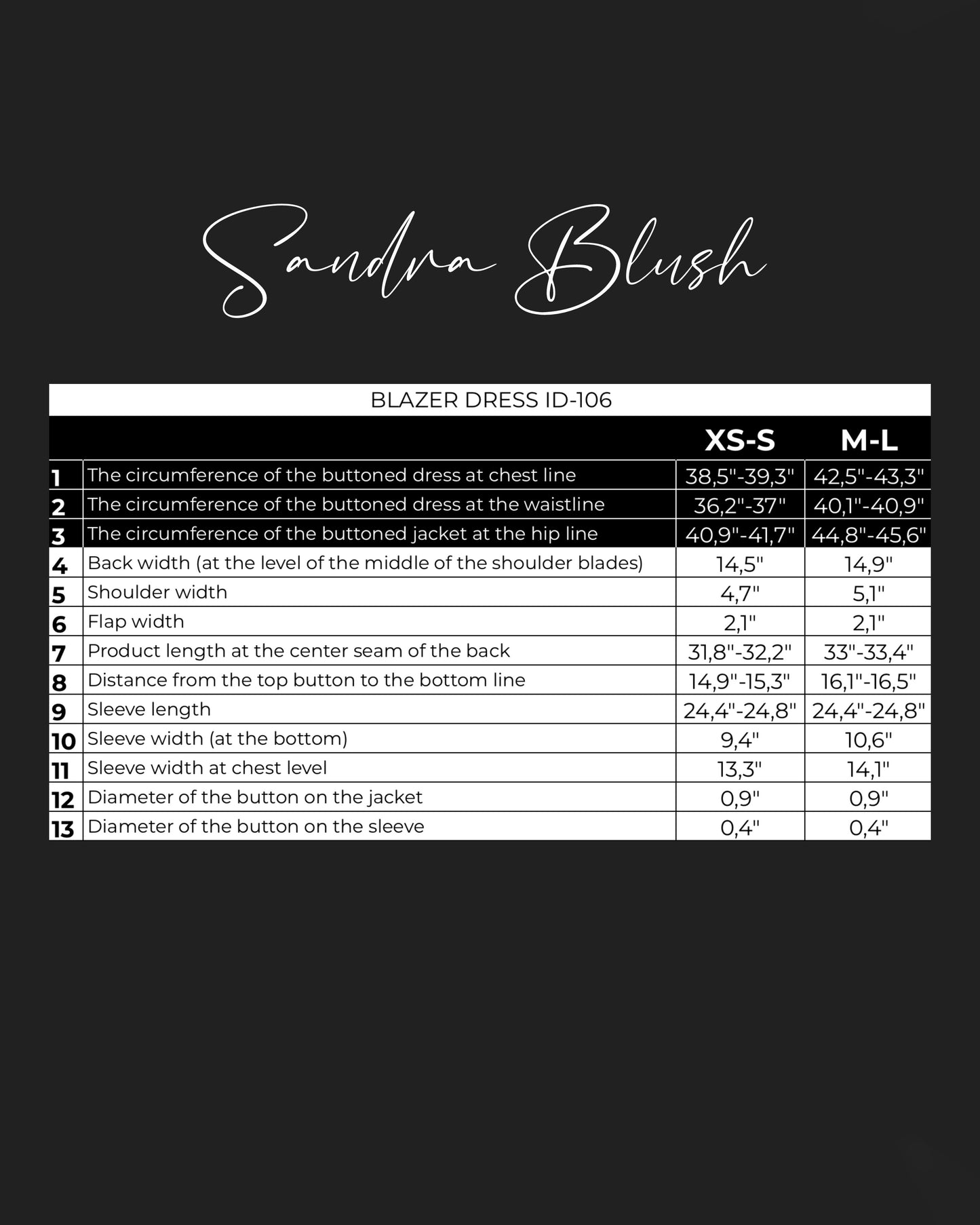 • Additional information: straight blazer dress. Fastens with buttons. Lapel collar. Decorated with rhinestones on the shoulder. Length 40 cm. High-quality viscose lining, pleasant to the body. Inserted dense shoulder pads for perfect shape. All pockets on the dress are fully functional
