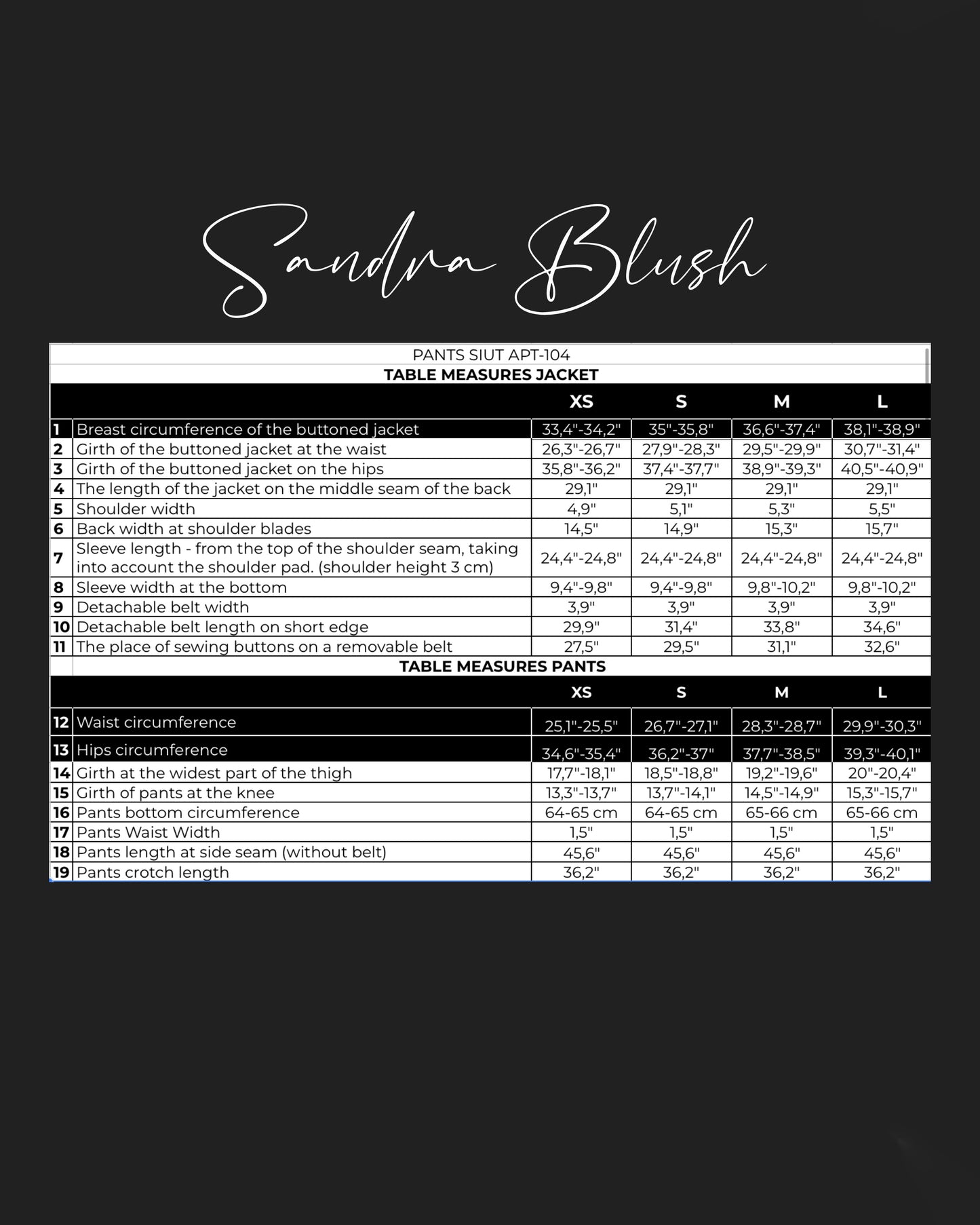 • Suit fabric: dense Italian suit crepe. Composition of fabric: 65% viscose, 5% elastane, 30% polyester. Stretchability of the fabric: LOW 0.5-1 cm.